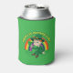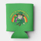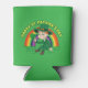 Can Cooler with an Illustration of a cute smiling leprechaun wearing a green suit, a top hat while holding a shamrock leaf, with a colourful rainbow in the background and text saying "Happy St. Patrick's Day"