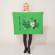Fleece Blanket with an Illustration of a cute smiling leprechaun wearing a green suit, a top hat while holding a shamrock leaf