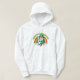 Hoodie with an Illustration of a cute smiling leprechaun wearing a green suit, a top hat while holding a shamrock leaf, with a colourful rainbow in the background and text saying "Happy St. Patrick's Day"