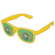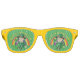 Sunglasses with an Illustration of a cute smiling leprechaun wearing a green suit, a top hat while holding a shamrock leaf, with a colourful rainbow in the background and text saying "Happy St. Patrick's Day"