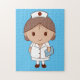Cute cartoon nurse with brown hair and a sweet smile. She is wearing a white nurse outfit and hat and carrying a blue medical file under one arm.