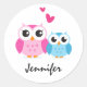 Cute cartoon owls with hearts personalised name classic round sticker