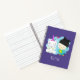 A spiral notebook with a whimsical image of a unicorn and bird. This pair is happily smiling while hanging out together. A little heart hovers above their head. Unicorn is white with angel wings and a pink horn. The bird is a greenish blue colour wearing a black toque with black kitty cat with ears. A blue cloud placed behind these happy best friends.
