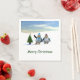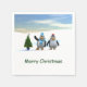 Two cute cartoon penguins happily standing by a Christmas tree in the snow. The boy is wearing a stocking cap and scarf and the girl has a red bow on her head.