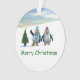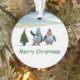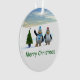 Two cute cartoon penguins happily standing by a Christmas tree in the snow. The boy is wearing a stocking cap and scarf and the girl has a red bow on her head.