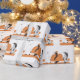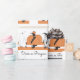 The product design features three cute penguins in Halloween costumes: ghost, pumpkin, and scarecrow. This funny animal illustration with personalised text makes whimsical and unique Halloween wrapping paper.