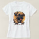 A playful cartoon-style pug puppy with big eyes and a happy expression, set against a warm orange background.