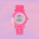 Adorable pink kid watch for kids featuring a sweet black and white cow reading a book . Personalise it with the child's name and choose the watch colour . Makes a great gift for Christmas or for birthdays .