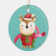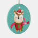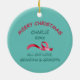 An adorable cartoon image of a little reindeer is on the front of this Christmas ornament designed for a grandparent or parent to give to a child as a keepsake. The reindeer is dressed in a red Santa hat and a red sweater with a Holiday tree emblem. He wears a green winter scarf. The image is placed on a teal blue background with snowflake confetti. The back of the ornament is also blue, with your custom text in five easy to change text fields. Make it say whatever you'd like! Appropriate for a young child, and either a boy or a girl.