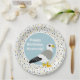 Create personalised party supplies for birthday parties and other special events. These paper plates features a cartoon style illustration of a seagull, a festive confetti print border, and your message in bold white lettering against a light blue background.