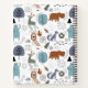 Colourful earth tones on cute cartoon-style woodland animals in a seamless pattern over a white background.