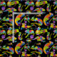 This patterned fabric features cute cartoon style illustrations of chameleons in bright, rainbow colours set against a black background. This material is perfect for crafting kid-friendly projects for fans of chameleons and other reptiles.