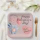 This cute custom Valentine day party plate features a pastel, dusty pink theme with a sweet little kitty cat holding a balloon. A sample name is printed over a heart at the bottom which you can personalise to include your own name or other custom Valentine's day message.