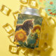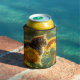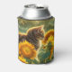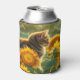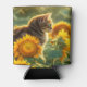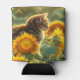 A charming tabby cat sitting in a vibrant sunflower field. A delightful can cooler or cosy to keep your drink snug.