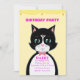Birthday party invitation card with a cute tuxedo cat as a messenger on light yellow background. All text ready to be customised.