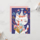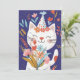 A smiling, happy cat is celebrating, wearing a party hat, and holding a bunch of flowers.