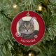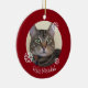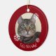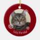 Feliz Navidad Tabby Cat Christmas ornament. This image of a kitty has a red background with white snowflakes. With white lettering it can be customised with your own text. A fun addition to your Christmas tree or as a gift for someone special!