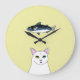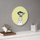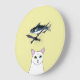 Round wall clock features cartoon drawing of Turkish Angora cat named Fat D. and mackerel.