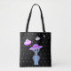 Unique bag with a cute cat in a hat and flying saucers only on the front side on starry black background. The heavenly cat is in light blue colour wearing a violet hat.