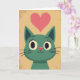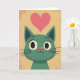 This Valentine's Day card shows a stylized cat’s head in deep teal sitting in the lower part of the design. The cat has big, wide eyes with black pupils and light cream irises, plus small lashes that make it look sweet and curious. Its tiny pink nose and slight smile give it a friendly, gentle expression, with thin whiskers stretching out from both cheeks. Above the cat, a soft pink heart floats near the top center, standing out against a warm sandy beige background. There isn’t any text on the card, so the heart and the cat do all the talking in a simple, romantic way. A light grainy texture covers the whole image, making it feel a bit like printed paper rather than a flat screen graphic. The teal and pink colors contrast nicely and keep the focus on affection and warmth ❤️💌🍫.