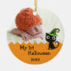 This ornament is an ideal keepsake of baby's first Halloween. It features a cute cat character with a witch's hat. Add a picture of the baby for added cuteness. It also features the year.