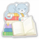 Cute little cat is lying on top of a stack of books. One book is opened in front of the stack.