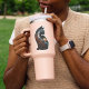 A minimalist image featuring a black cat silhouette integrated with a milky way galaxy landscape. The cat's profile morphs into an enchanting fusion of stars, planets, and the sun. The cat's fur and amber eye contrast against soothing shades of blue and grey planets. A dark moon evokes the atmosphere of a twilight galaxy, while the warm, golden sun merges with the cooler tones. Checkout our cat lover collection!