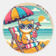 "Meet your new beach buddy: a chill ginger cat rocking shades, sipping a tropical drink, and totally living the dream. With 'I'm Just A Girl' floating above, it's the purr-fect vibe for fun in the sun!"