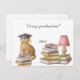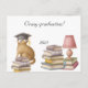 A cute funny cat with a graduation cap with a pile of books and a table light.