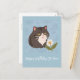 A cute cartoon cat with flower on the blue background personalised greeting card.
