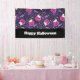 Halloween banner with an adorable Halloween themed pattern. Cats in witches hats, sitting on pink pumpkins with purple cobwebs in the background.