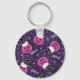 A key chain with an adorable Halloween themed pattern. Cats in witches hats, sitting on pink pumpkins with purple cobwebs in the background.