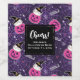 Bottle labels with an adorable Halloween themed pattern. Cats in witches hats, sitting on pink pumpkins with purple cobwebs in the background.
