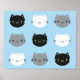 Kawaii black, white and gray cats and kittens on a baby blue background.