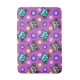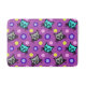 A medium size bath mat featuring a cute, colourful pattern design of grey and teal cats against a purple violet background with multicolored polka dot accents.