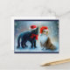 Too festive cat's ready for winter snow background with Santa hats and scarf.