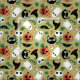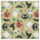 Cute Halloween fabric in black, orange, and olive green with a pattern of cats, pumpkins, bats, ghosts, witch hats, and more.