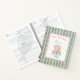 Collect your favourite recipes in this cute personalised recipe notebook. The whimsical design features a hand painted watercolor bear dressed in a chef's hat stirring up some batter in a blue bowl with gold hearts sprinkled around. The background is a modern blue and brown striped pattern. Personalise with a name for the title in coral pink script typography. Designed by Susan Coffey.