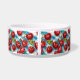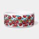 A watercolor ai illustration pattern of shiny red cherries, sage green foliage and blue chequered plaid pet bowl.