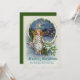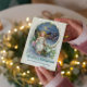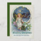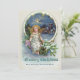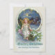 Vintage greeting card design, cute Cherub with gold wings sitting on a snow covered evergreen branch. Merry Christmas blue and gold vintage typography. Customisable vintage text for your message.