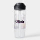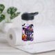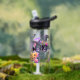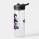 An adorable personalised Halloween water bottle that features a cute black cat in a witch's hat with a pumpkin. bat and cute purple and orange elements. Lots of black, purple and orange elements.