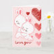 This Valentine's card features a vibrant handwritten typography "love you" with a cute chibi rabbit couple and red-pink scribble hearts.