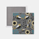 Trendy pattern with birds, flowers, branches with berries on grey. A magnet with grey background with gold and black birds, teal accents, and flowers in stylised art pattern. Design from Jenn's Emporium.