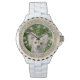 A young long-haired cream white coloured Chihuahua dog sitting in a flowering garden, photo taken by Katho Menden. This rhinestone watch for women with dial-plate is a gift idea for dog lovers.
