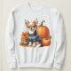 Adorable Chihuahua sitting among vibrant autumn decorations, featuring pumpkins and seasonal orange flowers, dressed warmly in an elegant knitted sweater, perfect for fall themes or cosy seasonal concepts.