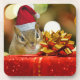 This cute chipmunk wearing a Santa hat is peeking out from behind a bright red Christmas present and gold bow to wish you “chipper holidays” for the season.