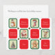 Cute Christmas themed images in individual green squares alternating with red squares that each have different holiday wishes. The images are a snowman, a candy cane striped stocking, a Santa Claus, a reindeer, a decorated Christmas tree and a gingerbread man cookie. All of the holiday wishes can be easily changed to any greeting you prefer. The text on the back can also be easily changed or deleted if you want to handwrite your message.