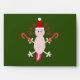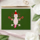 This envelope features a digital art image of a cute Christmas Axolotl. The Axolotl is pale pink with bright pink gills. It is holding a red and white striped candy cane in each hand and is wearing a festive Red and white Santa hat. The axolotl is type of Salamander from Mexico.
