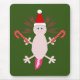 This awesome mousepad features a digital art image of a cute Christmas Axolotl. The Axolotl is pale pink with bright pink gills. It is holding a red and white striped candy cane in each hand and is wearing a festive Red and white Santa hat. The axolotl is type of Salamander from Mexico.