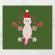 This awesome sheet of Christmas sparkling wine bottle labels features a digital art image of a cute Christmas Axolotl. The Axolotl is pale pink with bright pink gills. It is holding a red and white striped candy cane in each hand and is wearing a festive Red and white Santa hat. The axolotl is type of Salamander from Mexico.